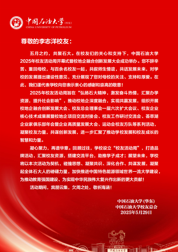 五月之約,共聚石大。在校友們的關(guān)心和支持下,中國石油大學2025年校友活動周開幕式暨校地企融合創(chuàng)新發(fā)展大會成功舉辦。您不辭辛苦、重回母校,與百余名校友一起,共敘師生情誼,共話發(fā)展未來,對學校的發(fā)展提出建設(shè)性意見,充分展現(xiàn)了您對母校的關(guān)注、支持和厚愛。在此,我們謹代表學校向您表示衷心的感謝和崇高的敬意!